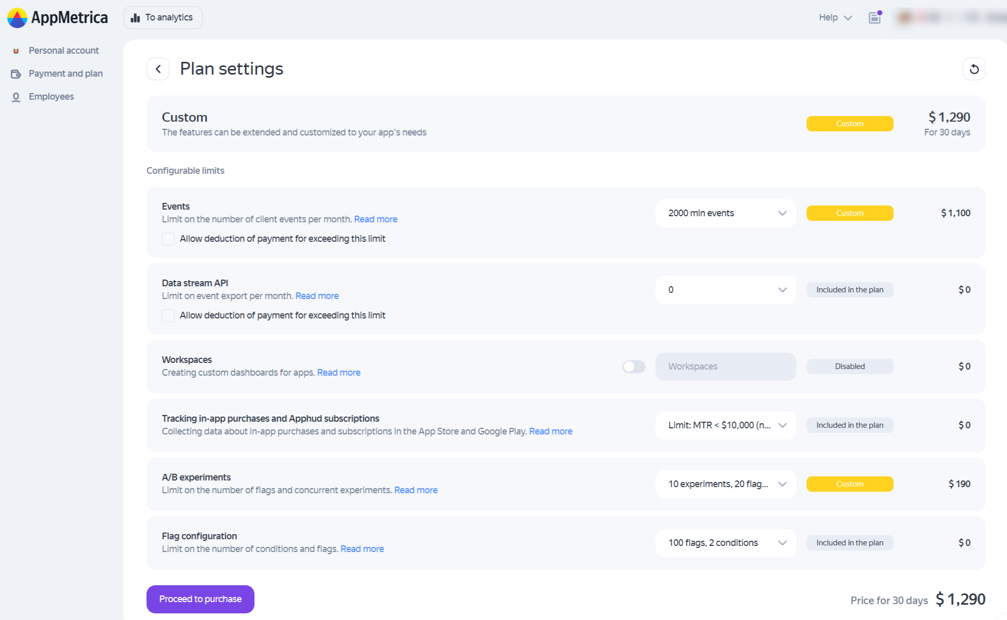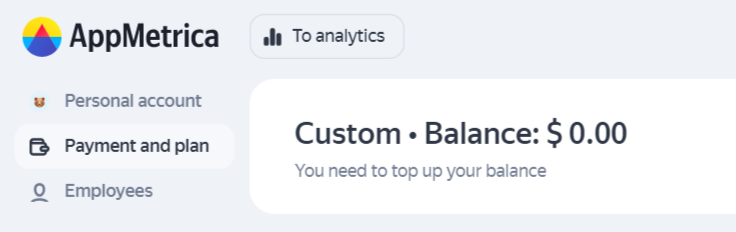 When registering an AppMetrica account, you automatically get the Free plan. If you want to use paid tools, switch to the Custom or Pro plan.