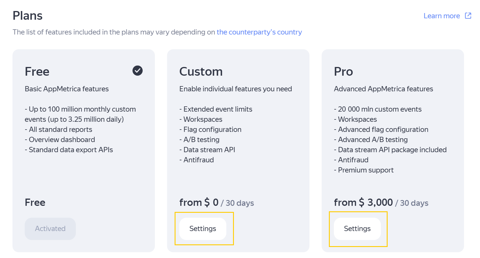 Proceed to configuring a plan by clicking Settings under the description of the plan you want to activate (Custom or Pro).