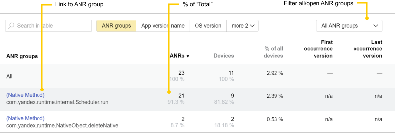 You can export the ANR log description as a TXT file. To do this, open the relevant ANR group and click Open ANR log→ Export.