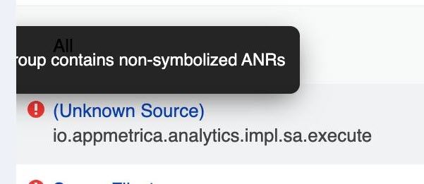 If the mapping or dSYM file was not uploaded during the app build process, a warning about unsymbolicated ANRs will appear in the group list.