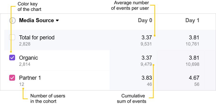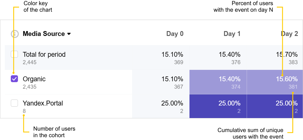 This report lets you select groups of users (cohorts) and track metrics of completed events for the selected period of time in the cohort. You can use the report to assess the quality of traffic sources and the quality of the audience produced by media sources. Also, the report allows you to analyze how many users have completed an event in the selected cohort. In this way, you can calculate the users from a particular partner.