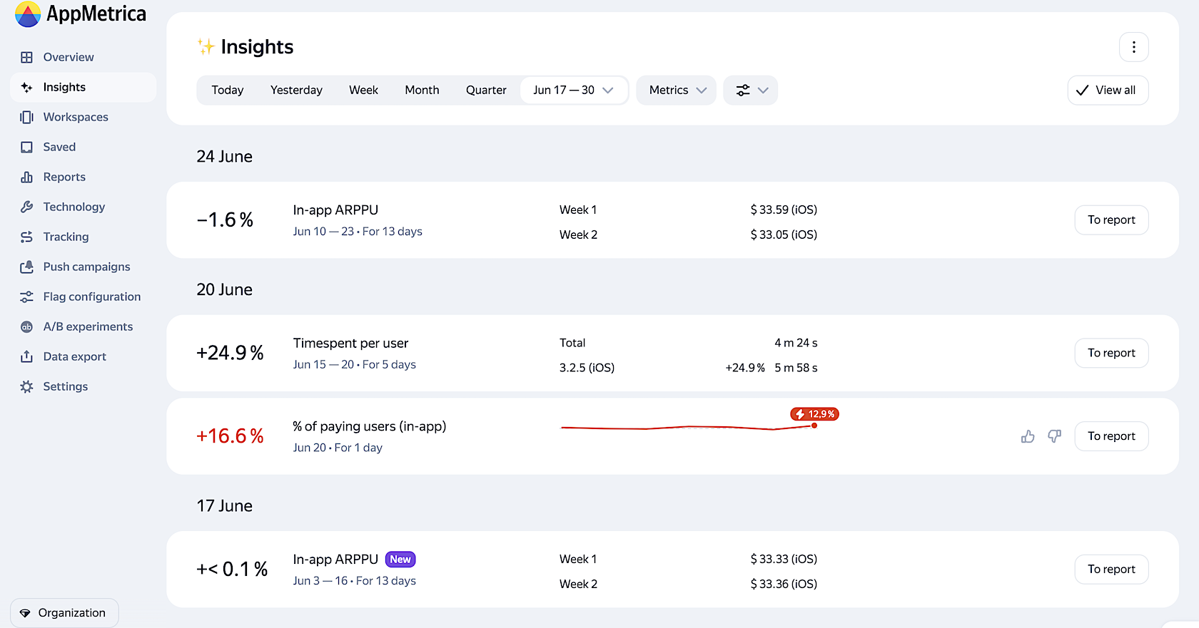 Insights is a valuable tool for all AppMetrica users. It’s designed to simplify app monitoring, saving you time and ensuring you never miss critical changes in your app’s key metrics.