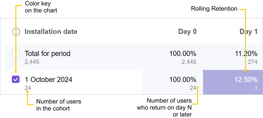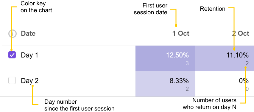 - On the next day after the installation (Day 1, which is outlined with a dotted line), 1 user from the first group and none from the second group returned to the app. The Retention metric is 50% for the first group, and 0% for the second. The installation dates are different, and you can track changes in the Retention metric for the specified period after the installation.