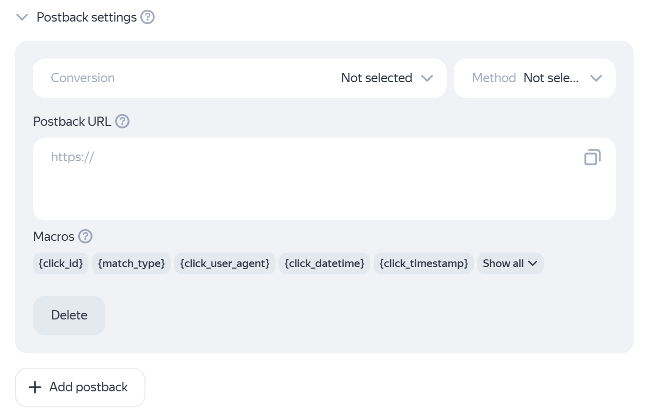 Some media sources can set a permanent Postback URL for their network. In this case, the postback is sent to the media source regardless of other settings. It can't be edited.