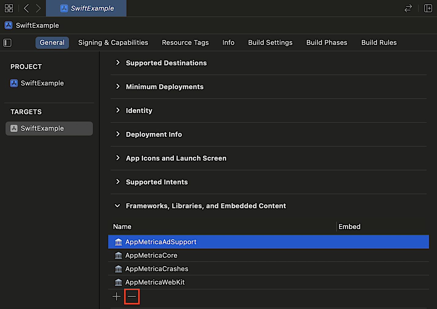 .target( name: "MyTargetName", dependencies: [ .product(name: "AppMetricaCore", package: "AppMetrica"), .product(name: "AppMetricaCrashes", package: "AppMetrica"), .product(name: "AppMetricaWebKit", package: "AppMetrica"), // .product(name: "AppMetricaAdSupport", package: "AppMetrica"), // This module is disabled ] ),