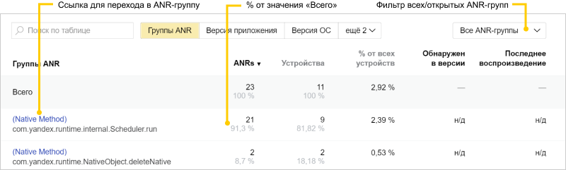 С помощью отчета можно определить, в каких случаях ANR случается чаще всего. Используйте эти сведения для подготовки исправлений.
