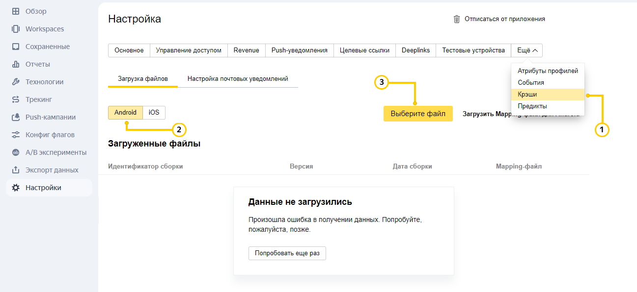 Список отсутствующих файлов можно посмотреть на странице Настройки → Крэши вашего приложения в AppMetrica.