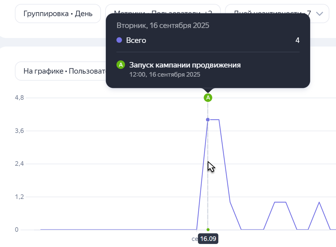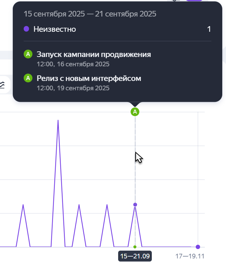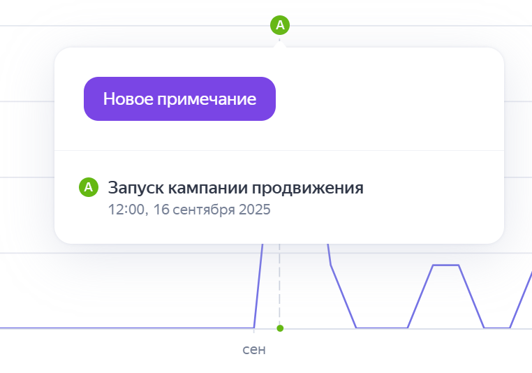 Найдите на шкале времени нужную дату и нажмите на соответствующую точку на графике — откроется окно создания примечания.