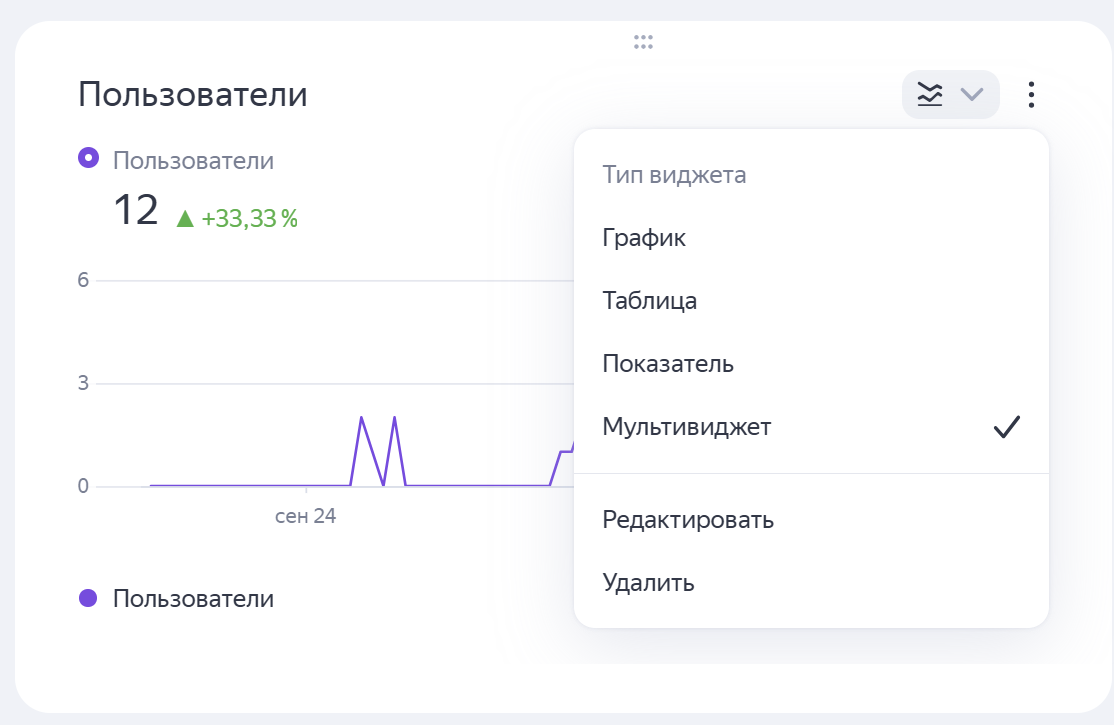Данные в виджетах могут быть представлены в виде графиков, таблиц, показателей или мультивиджетов. В мультивиджетах есть одновременно и показатели, и графики. Вы можете переключаться между этими представлениями: