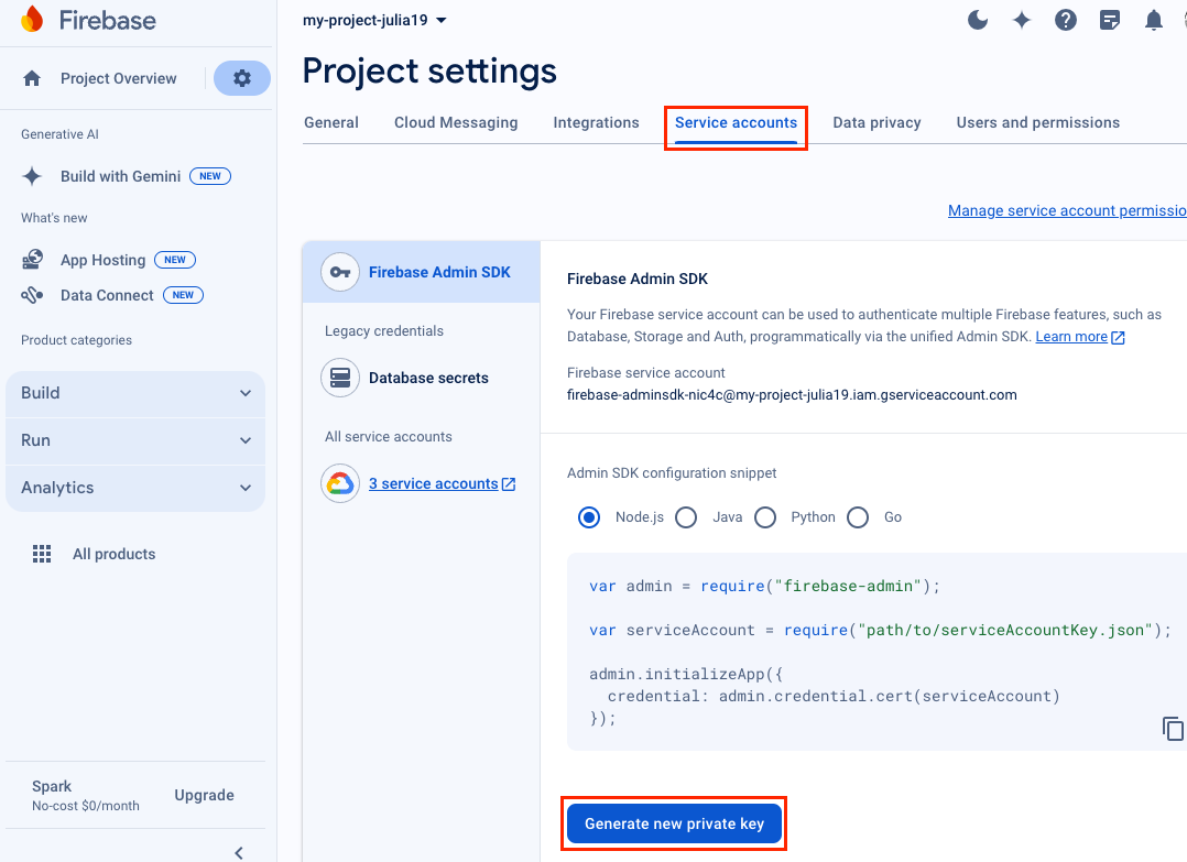 В Project settings перейдите на вкладку Service accounts и нажмите кнопку Generate new private key.