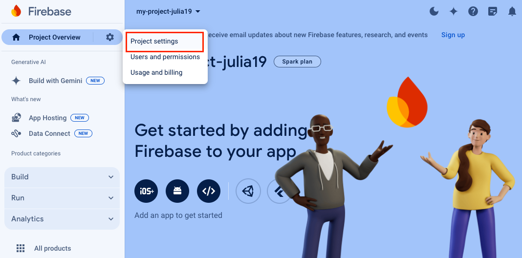 Перейдите в Firebase Console, нажмите Get started with a Firebase project и создайте проект.