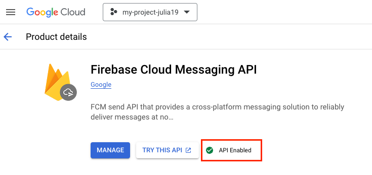 Выберите свой проект и проверьте статус FCM API.