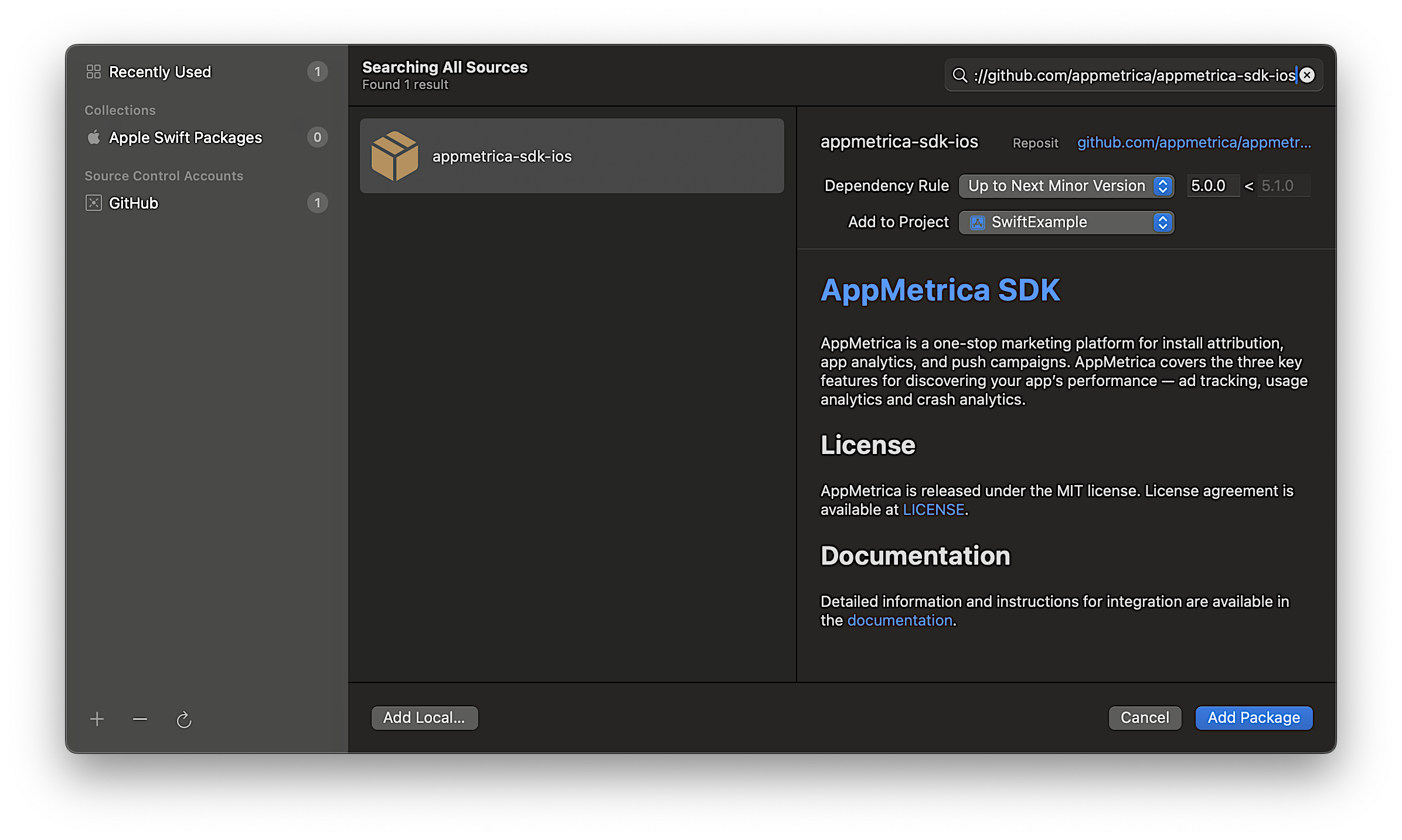 .package(url: "https://github.com/appmetrica/appmetrica-sdk-ios", from: "5.0.0")