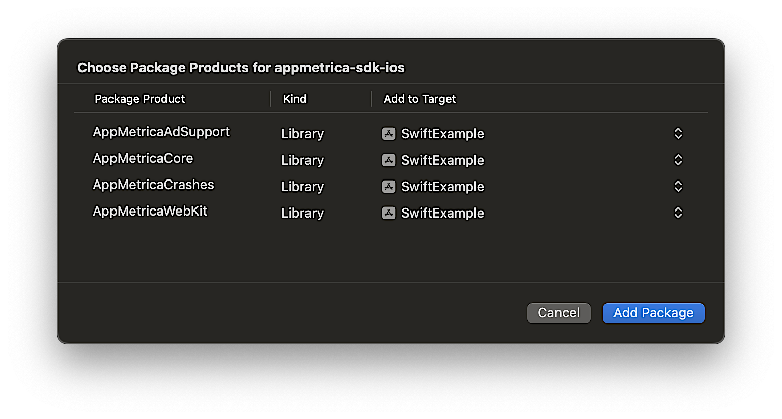 AppMetricaCore— обязательный основной модуль SDK. Должен быть подключен для работы с AppMetrica.AppMetricaAdSupport— модуль используется для сбора идентификаторов, включая IDFA.AppMetricaCrashes— модуль предназначен для отлова крэшей и отправки ошибок.AppMetricaWebKit— модуль позволяет осуществлять отправку событий из JavaScript кода в WebView.