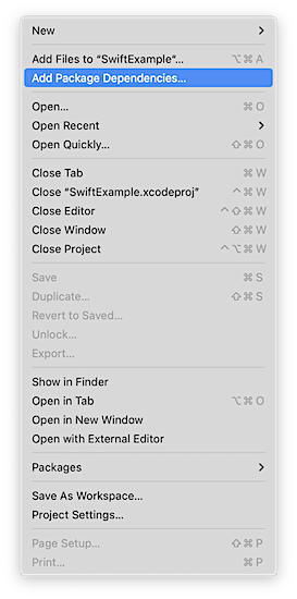 В окне Xcode навигатора проектов (Project Navigator) выберите свой проект (если у вас используется Workspace). Затем в верхнем меню нажмите File и выберите Add Package Dependencies....